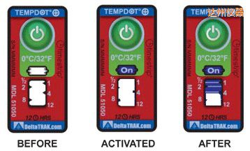 TempDot™Plus標(biāo)簽應(yīng)存儲(chǔ)在室溫下,并必須在反應(yīng)溫度閾值以上被激活。激活是通過(guò)用手指推壓。"On"字出現(xiàn)在第一個(gè)窗口中顯示激活。之后5分 鐘內(nèi),在反應(yīng)溫度或低于反應(yīng)溫度的情況下將標(biāo)簽貼到產(chǎn)品上。藍(lán)色染料熔化并以控制的速率遷移,,經(jīng)過(guò)白色大窗口。這表示暴露在溫度閾值以上的累計(jì)時(shí)間。當(dāng)溫 度低于閾值時(shí),,該染料固化并停止移動(dòng)。如果溫度超過(guò)閾值,,TempDot®Plus標(biāo)簽提供即時(shí)的視覺(jué)跡象。