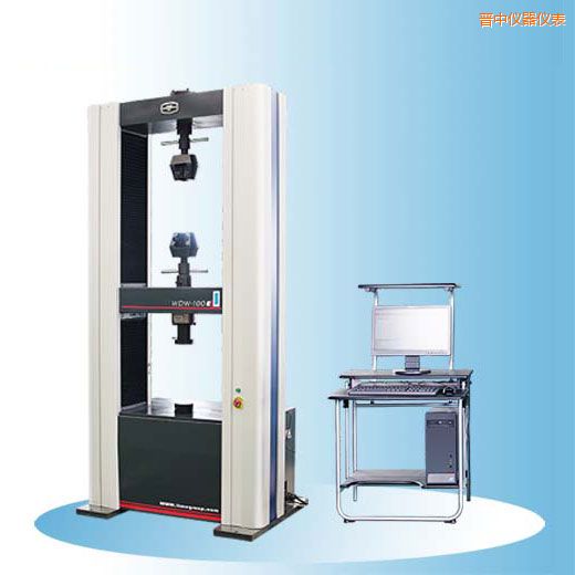 WDW-200E/300E微機控制電子萬能試驗機采 用雙空間門式結構,,標準為上空間拉伸,下空間壓縮、彎曲,,拉壓空間可相互轉換。電子萬能試驗機主機部分由四根導向立柱、上橫梁、中橫梁、工作臺組成落地式 框架,調速系統(tǒng)安裝在工作臺下部。由調速精度高、范圍寬、性能穩(wěn)定的日本松下交流伺服電機通過同步齒形帶減速系統(tǒng)帶動滾珠絲杠副旋轉,滾珠絲杠副驅動中橫 梁,帶動拉伸輔具(或壓縮、彎曲等輔具)上下移動,實現(xiàn)試樣的加荷與卸載。萬能試驗機采用該結構保證機架有足夠的剛度,,同時實現(xiàn)高效、平穩(wěn)傳動。主機主要 零部件在加工中心進行加工,保證了主機的精度。滾珠絲杠為 E5 級。 1.交流伺服驅動器和交流伺服電機,性能穩(wěn)定、可靠,具有過流、過壓、超速、過載等保護裝置,調速比可達 1:100000。 2.具有過載、過流、過壓、位移上下限位和緊急停止等保護功能。 3.電氣控制線路參照國際標準,符合國家試驗機電氣標準,抗干擾能力強,保證了控制器的穩(wěn)定性,實驗數(shù)據準確性。