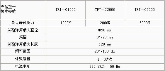 產(chǎn)品概述: TPJ-G系列彈簧高頻疲勞試驗機采用電磁激勵、試件(彈簧)共振原理,系統(tǒng)自動處于最佳諧振狀態(tài),勿需調(diào)整,微機控制彈簧試驗機,起動一觸即發(fā),進口彈簧試驗機,性能穩(wěn)定可靠。操作簡單,日本彈簧試驗機,操作人員勿需培訓。 功能特點: 試驗機設(shè)有振動次數(shù)及頻率的數(shù)字顯示及次數(shù)預置、記憶等功能。該機既可以做單對彈簧的試驗,也可做多對彈簧的試驗機。 技術(shù)參數(shù):