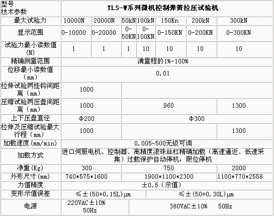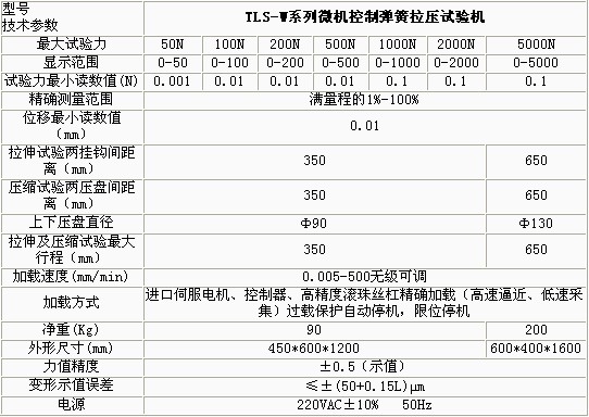產(chǎn)品概述: TLS-WI系列微機控制拉壓彈簧試驗機依據(jù)JB/T7796-2005《拉壓彈簧試驗機技術(shù)條件》規(guī)定的技術(shù)要求制成。該型拉壓彈簧試驗機主要用 于測試各種螺旋彈簧及彈性元件的強度,即在一定的變形量(或高度)下測試彈簧的試驗力或在一定的試驗力下測定彈簧的高度或變形量。 功能特點: 本機主要適用于各種彈簧的強度試驗、力學(xué)性能及工序能力分析。 本機軟件包有速度控制、參數(shù)輸入、數(shù)據(jù)處理、結(jié)果觀察、圖表顯示、圖表打印、數(shù)據(jù)保存等功能模塊組成。 試驗方式多樣化,可以設(shè)置彈簧的試驗力,檢測彈簧的剩余高度或變形量;也可以設(shè)置彈簧的剩余高度或變形量,檢測試驗力等功能。 多點自動變速采集數(shù)據(jù),并自動返回到初始位置,整個試驗過程自動化。 過載自動返回,以保護傳感器不受損壞。 具有強大的數(shù)據(jù)處理及數(shù)據(jù)統(tǒng)計功能,彈簧拉伸試驗機,繪制剛度曲線、計算彈簧的分段剛度,床墊彈簧疲勞試驗機,可以進行數(shù)據(jù)統(tǒng)計,繪制正態(tài)分布圖、計算工序能力指數(shù)。采用數(shù)控電機調(diào)速系 統(tǒng)或進口交流伺服電機及調(diào)速器和精密滾珠絲杠副組成傳動系統(tǒng),彈簧機廠,與高精度負荷傳感器、位移傳感器及數(shù)字式數(shù)據(jù)采集卡、PC組成測控系統(tǒng),實現(xiàn)了穩(wěn)定可靠運行 及精確測量。 技術(shù)參數(shù): ![]() ![]()