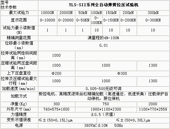 產(chǎn)品概述: TLS-SII系列全自動數(shù)顯式拉壓試驗機是適用于拉壓試驗的新型試驗設備。試驗機主機的設計具有外形美觀、操作方便、性能穩(wěn)定可靠的特點。試驗機 采用數(shù)控電機及先進的單片機控制技術(shù)加載及控制,能實現(xiàn)雙速預置。實現(xiàn)了高速逼近,低速采集。提高了測試精度,威海彈簧試驗機售后維修,保證了試驗效率。 功能特點: 自動變速檢測5個測試點,并自動返回到試驗初始位置 LED顯示,彈簧壓縮試驗機,人機對話直觀明了便于操作 可以選擇多種測試方法,順次自動完成一批工件的測試,可查看已測數(shù)據(jù) 傳感器引起的變形量可以補償,既傳感器和整機剛度引起的變形不影響位移精度。 可實現(xiàn)試驗力、試驗速度、位移等多種控制方式,具有以下功能: 設定變形量F,檢測彈簧的試驗力P; 設定彈簧的剩余高度H,檢測彈簧的試驗力P; 彈簧變形的檢測已工作壓盤接觸彈簧為準,氣彈簧壓力試驗機,此時試驗力有反應,試驗力(初始力)的大小任意設定。 技術(shù)參數(shù):