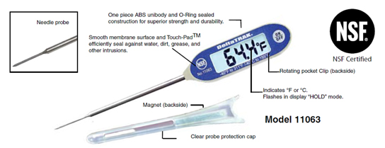 這個(gè)大屏顯示的防水溫度計(jì)是測(cè)量烹煮中和保溫中食物溫度的理想工具。根據(jù)FDA的食品法典第4-302條,溫度計(jì)的結(jié)構(gòu),其探針針尖設(shè)計(jì)保證其快速的反應(yīng)時(shí)間,土壤溫度計(jì),用以測(cè)量較小塊/片的食物。 其特點(diǎn)包括: