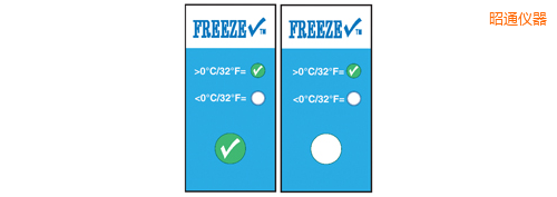 TempDot FreezeCheck標簽,,型號54000,,用來表示溫度低于0°C。如果溫度低于0°C,,標簽不可逆轉地發(fā)生變化,,變成白色,,勾形標記消失。 冷凍檢查標簽用來指示溫度低于0°C. 當溫度下降到低于臨界點, 指示劑不可逆轉的改變從清晰到白色并且綠色合格標志不再顯示。