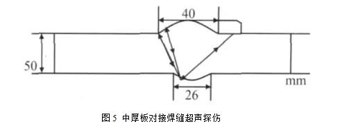 中厚板對接焊縫超聲波探傷時探頭下擴散聲束在焊縫表面的反射回波很容易被誤判為缺陷。如在厚板焊縫中(T=50mm左右)常發(fā)現(xiàn)距背面4~10mm深度范圍內(nèi)的熔合線附近有不同長度連續(xù)的超標(biāo)反射波(圖5).
