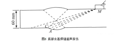 同樣道理在圖6所示焊縫探傷時若A點處焊縫表面不利于軸線聲束反射而只與下擴散角范圍內(nèi)某部分聲束相垂直時則得到較高的回波其儀器提供的深度和水平距離卻錯誤地被指示為C點。