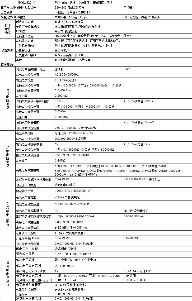 功能特點: 1. 緊跟新標(biāo)準(zhǔn)要求,電器安規(guī)綜合測試儀,滿足各行業(yè)標(biāo)準(zhǔn)檢測:接地電阻測試電流最大到32A,安規(guī)綜合測試儀價格,絕緣測試電壓最大到2500V; 2. 集成多種測試功能,五合一安規(guī)綜合測試儀,減少產(chǎn)線操作人員:測試系統(tǒng)集成了交流耐壓、直流耐壓、絕緣電阻、接地電阻等安全性能綜合測試,電氣安全性能綜合測試儀,一個工位,安全特性綜合測試儀,一鍵啟動,安全綜合測試儀使用方法,快速完成全功能檢測; 3. 20個測試組,安全性綜合測試儀,可步組編程:適用于混合高效產(chǎn)線; 4. 測試速度快,電氣安規(guī)綜合測試儀,四項功能測試2.5s完成; 5. 選配USB接口,電氣安全綜合測試儀,實現(xiàn)測試結(jié)果海量存儲;